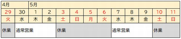 ゴールデンウィーク期間中の弊社サポートセンターの営業日と休業日は以下の通りです。