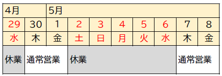 ゴールデンウィーク期間中の弊社サポートセンターの営業日と休業日は以下の通りです。